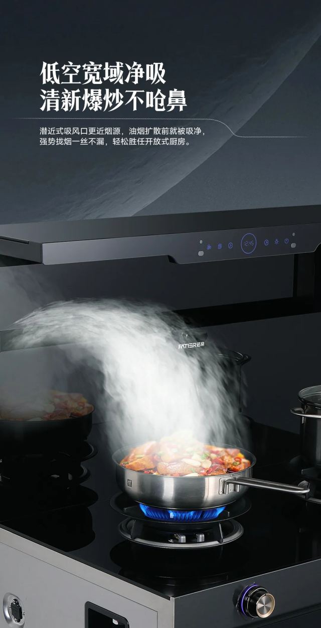 法帝X5ZK蒸烤一體集成灶低空寬域凈吸,油煙剛剛產生就被迅速吸走排空,避免油煙過臉吸入呼吸道,大大提升了用戶的烹飪體驗。