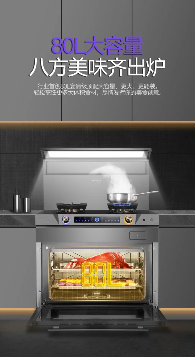 法帝星耀XL15ZK蒸烤一體變頻集成灶擁有80L大容量蒸烤箱,四層擱架設計,滿足大食量的需要。十大智能烹飪模式集成一體,無論是蒸菜、燒烤、烘培還是發酵、空氣炸,都能一鍵搞定,上烹飪下蒸烤,多人家宴片刻即達。